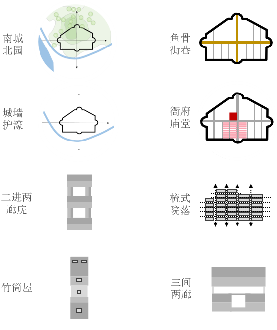 从历代古城演进中的空间形制来看,古城呈现“三重城脉,古今层积”的 特征。各个时代的建筑有机交织,空间肌理新旧共生,“南城北园、鱼骨街巷、 衙府庙堂、城墙护壕”格局依然存在。