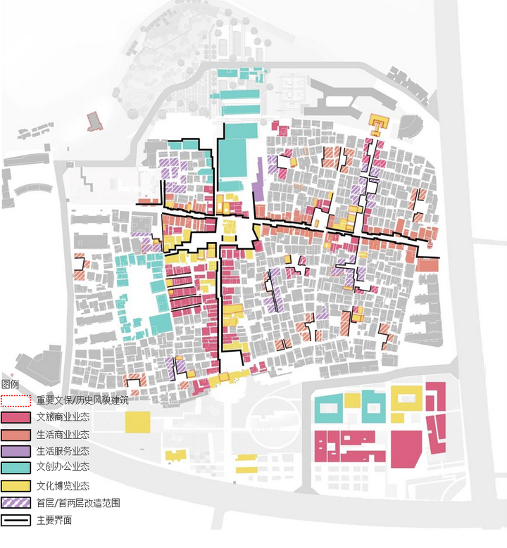 十字主街:临街集聚文旅商业、生活商业、文化博览业态,同时在垂直向度混合; 次巷:围绕公共空间点状布局生活商业、生活服务业态,以首层或首两层改造为主;