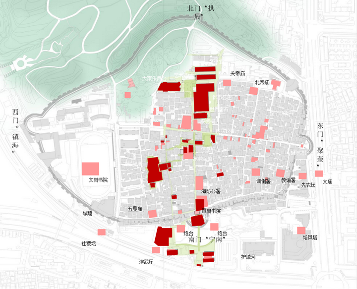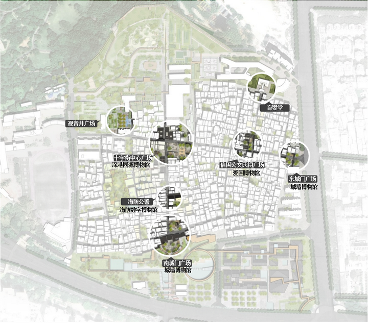总体遵循起承转合的叙事逻辑, 从南广场 的万有市集出发,沿护城河道进入点兵校 场和地下遗址博物馆,感受守御镇海的历 史记忆; 进入南城门,游走在中山南街, 感受古城文脉的万千气象; 驻足衙署前, 体验东西街的繁荣市井与城中村的活色生 香, 来到北端的艺术展场,体验古城文化 与未来创新的碰撞冲击,最后沿着城墙公 社复合生态基面进入中山公园,享受大自 然的宁静。