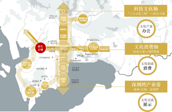 在全局性建构方面,南头古城作为沿深南 大道文化消费轴和深圳湾文化产业带的起 点,在规划功能上聚焦创意办公、创意消 费与文化展示三大功能,进一步完型南山 区文化产业空间格局,点燃湾区的文化力量。