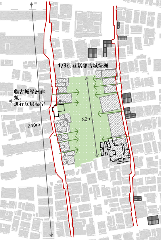 梧桐街、春景街毗邻古城最大绿 地,设计对街巷界面进行底层架空 透明化处理,强化绿洲的可达性与 可见度,最大限度使用绿洲空间 。