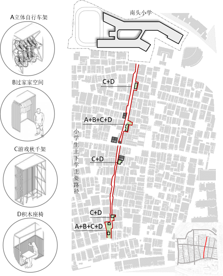 朝阳街北边正对南头小学,是是小 学生上学的主要路径,临街巷和边 角公园植入壁画式黑板、积木座椅 等互动性功能模块,打造安全温情 的见学街巷,激发活力与童趣