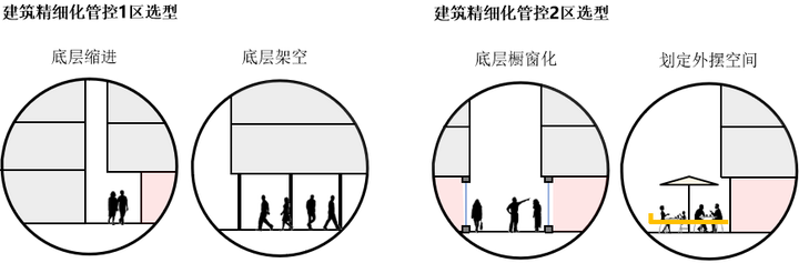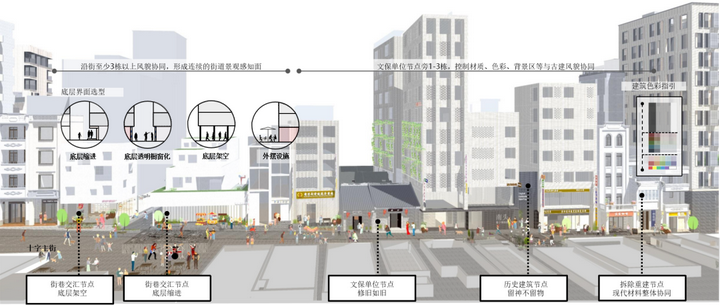 控制目的:重塑九街格局在现代生活中的空间感知,形成新旧共生的多样街巷风貌 控制手段:差异化界面引导+节点区域建筑改造的精细化管控。