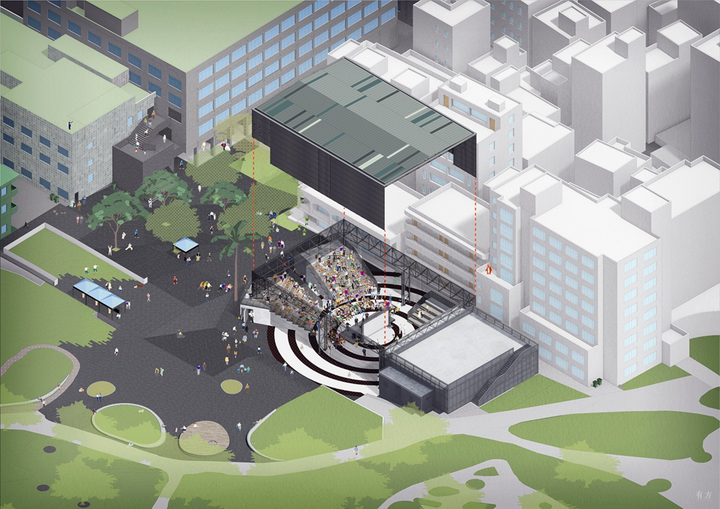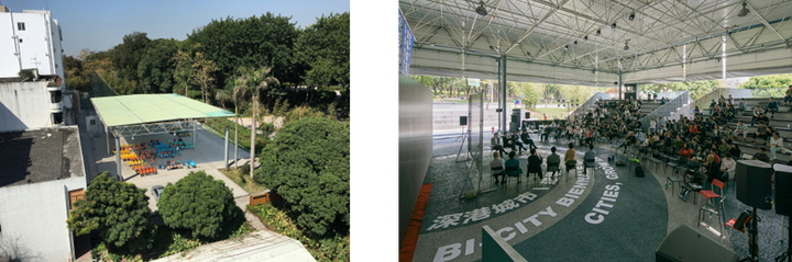 在改革开放初期、深圳快速工业化进程中,为满足年轻人业余文化生活举城兴建的 “大家乐舞台”,见证了深圳的早期打工文化。本次改造在现有钢屋架下方置入三座坡起的观众席,在提升观演氛围的同时,如散落的巨石般构建出非正式的戏剧性空间。屋架四周为可升降织物幕帘系统,幕帘起落之间,种种正式非正式、室内室外、演出集会的活动将在同一场所上演。作为双年展实质性介入城市改造的成果,大家乐舞台多种新的使用方式,也将延续至展览结束后的居民日常生活之中。