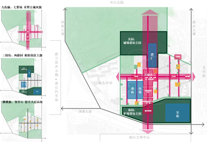 关注古城与周边城市功能的联系,将南头 古城作为整合区域生态人文景源的活力枢 纽