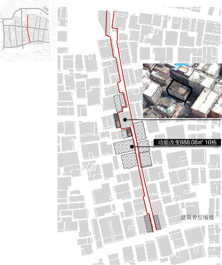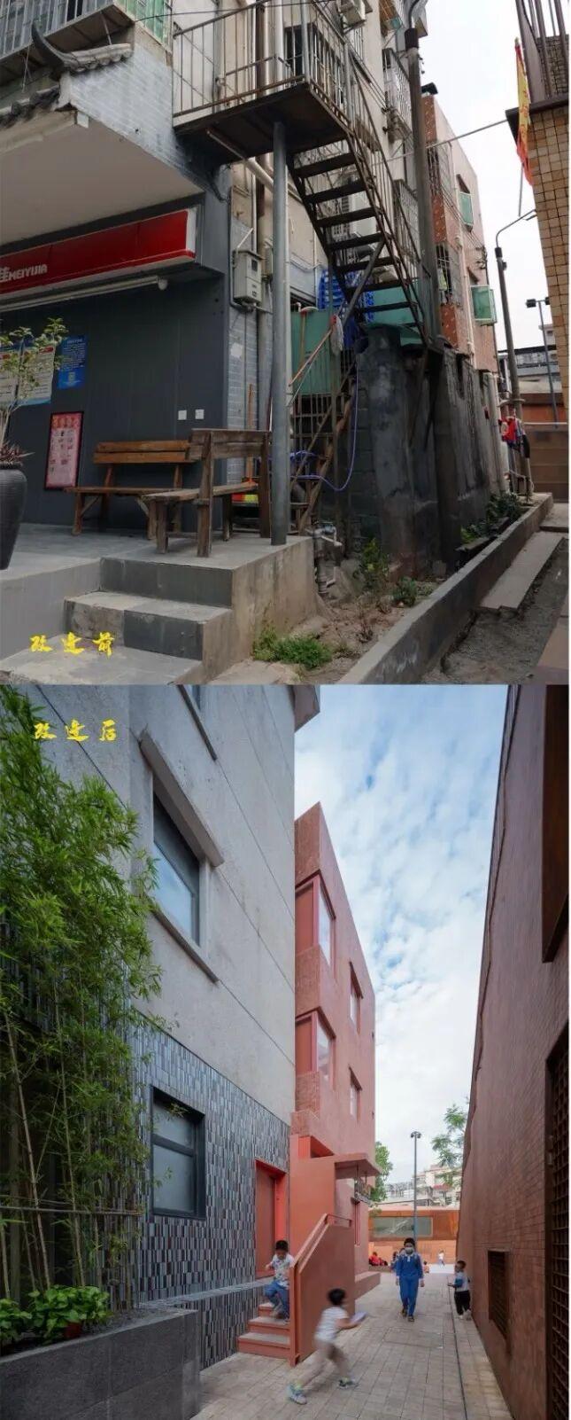 乐平街街巷两侧建筑致密,城中村一线天特征显著,局部缩进建筑底层 空间,通过 “装修式的微改造”,增设无障碍和采光设施,改善街巷步 行与光照环境。