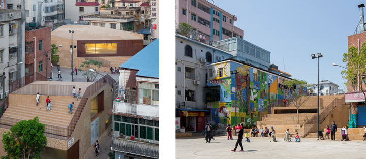 报德广场处于古城十字街(B区)中心,广场水磨石地面的篮球场,在上世纪七十年代为南头公社的打谷场,我们说服村委,让他们同意将广场边上两栋临时商用铁皮屋改建为社区公共活动空间