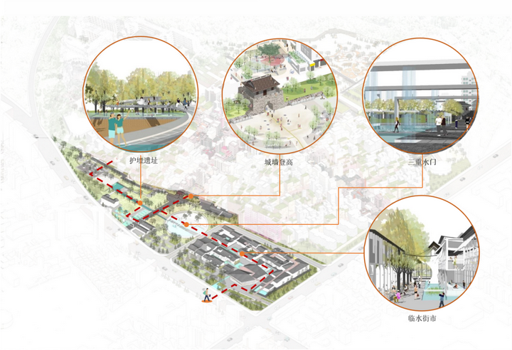 发现城墙、城壕等历史遗存的独特价值,植入符合现代人群需求的 特色项目,创造全新的文化融合场景,作为游客、居民活动汇集的 场所
