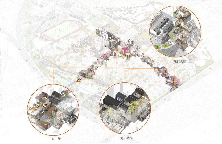 十字主街中心广场集聚古建、双年展建筑,是感知古城历史的核心场所,架空或缩进建 筑底层,串联球场与井剧场,连接二层和屋顶平台,建立多维游径,打开三层基面上的 古、今、未来全景展开面,营造具有历史质感的“融合场景”。