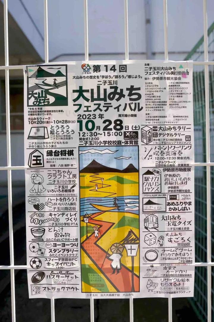 每年10月,二子玉川会举行大山祭,包括各种绘画、棋牌类、球类体育活动、音乐会、本地物产展、关于二子玉川老铁路“玉电”的知识竞赛等,来加强人们和本地、自然、历史的联系。