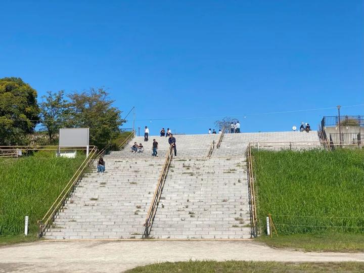 从河边回看二子玉川公园台阶,人们在这里午休,图©chimian
