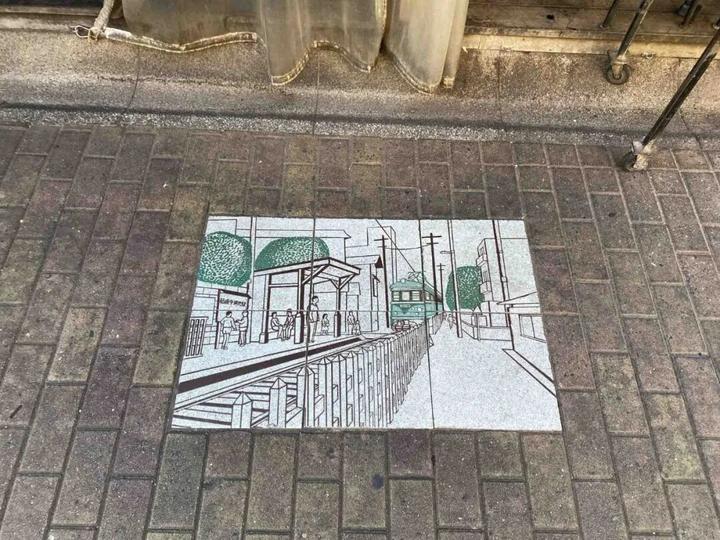 居民区路边的花园和二子玉川旧铁路“玉电”遗址标记,图©chimian