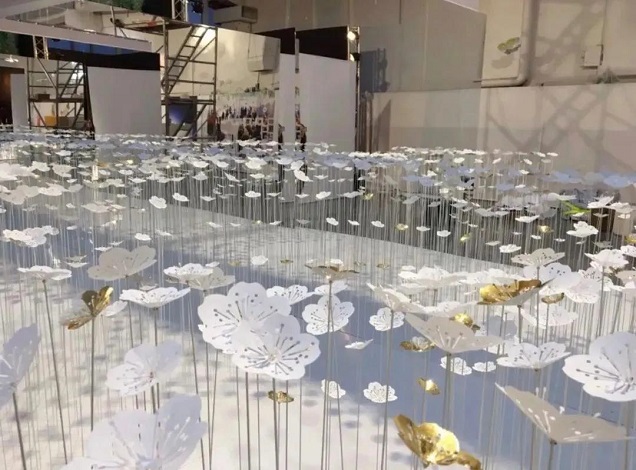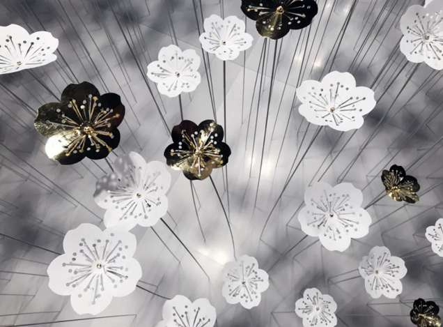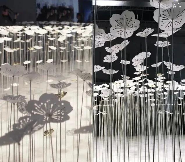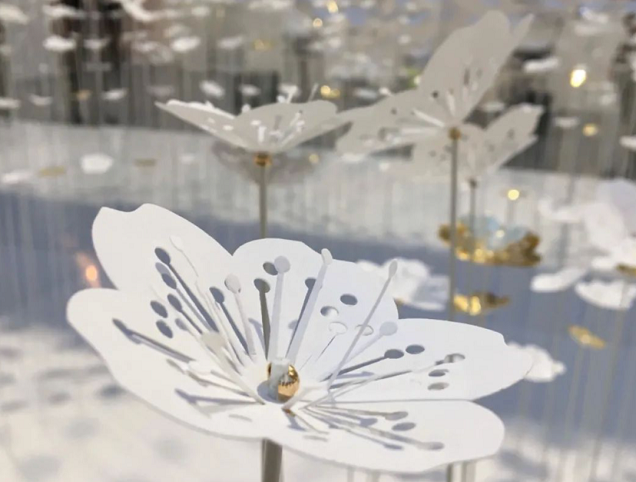 贾丁·迪弗 Jardin d‘Hiver 委托法国Manymany设计公司,用300朵白花和金色的花进行组合,利用9平方米的三面镜子中无限地反射出来,形成了一个梦幻般和纯净沉浸式的艺术体验。