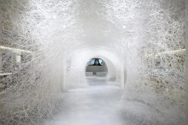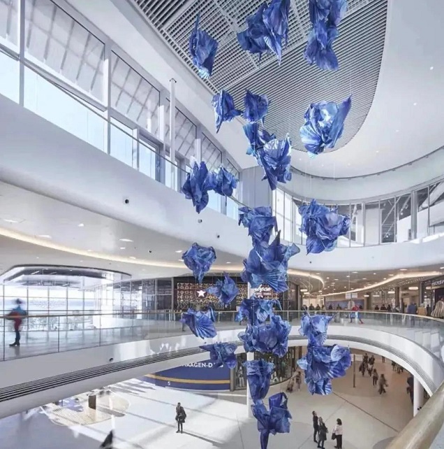 日本艺术家Chiharu Shiota精湛的作品“我们要去哪里”的编织纱线装置艺术,通过对生活的发现与理解,想象出一百多艘船悬挂在玻璃屋顶上面,让顾客仿佛至于秘境之内。