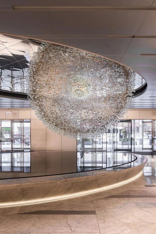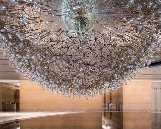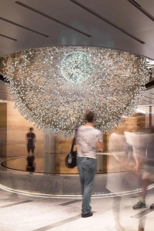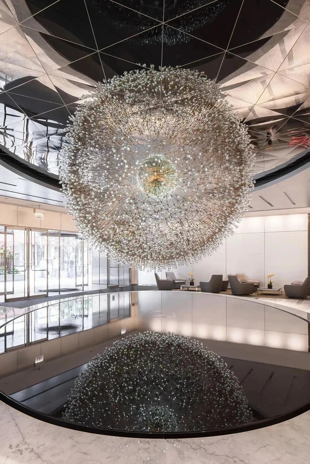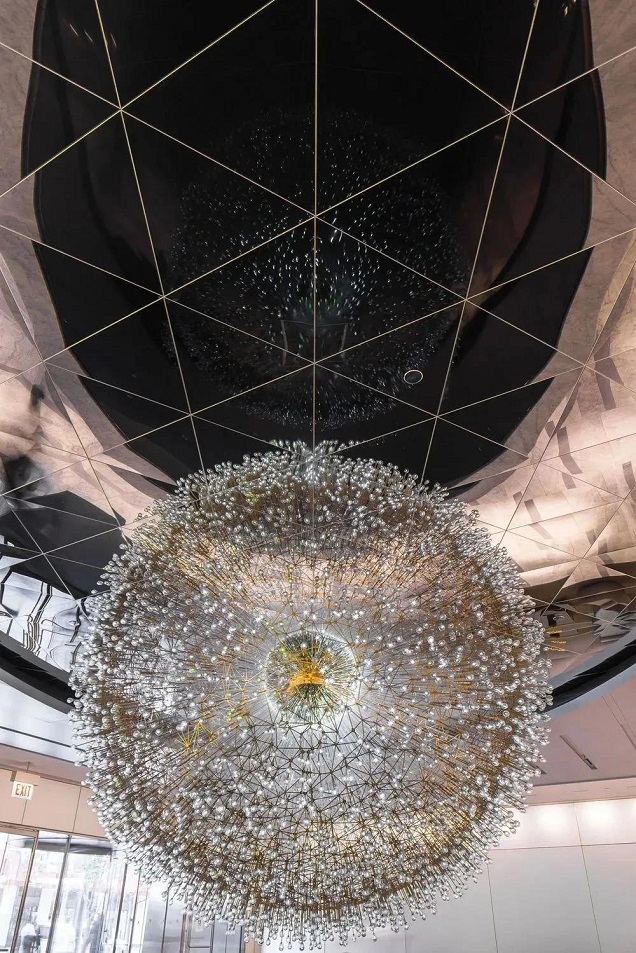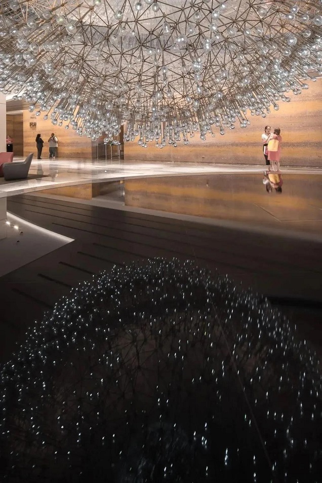 这些点创造了细腻的铁艺。南半球是在天花板反射,三千多个玻璃器皿反射池和镜面抛光钢之间的双重反射暗示了无限感。