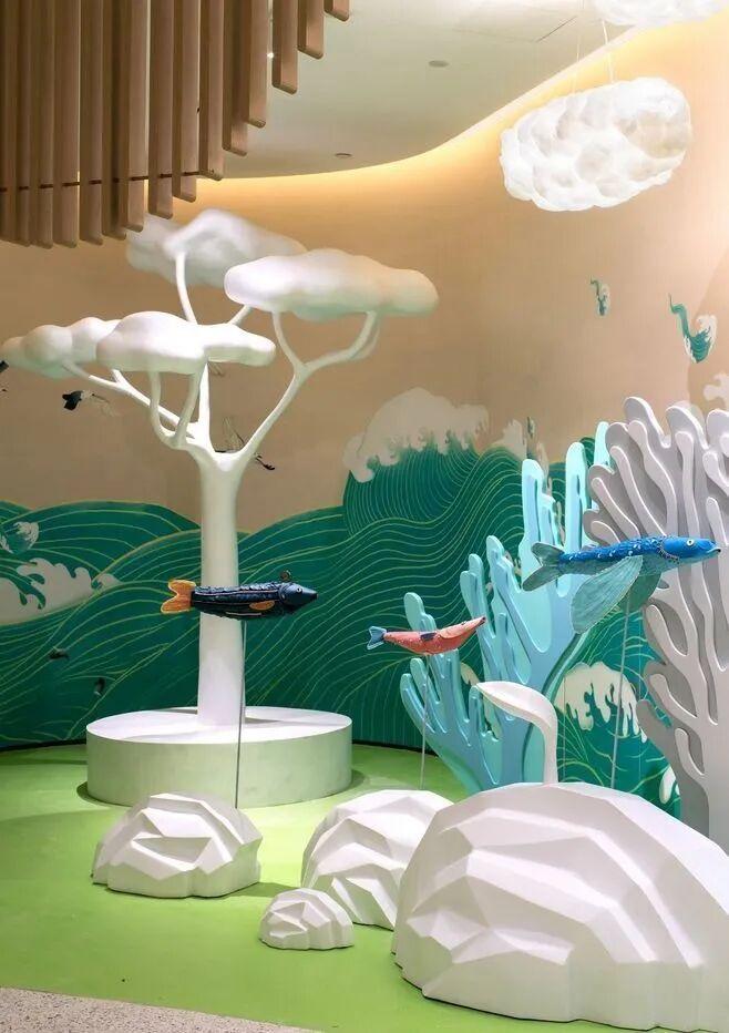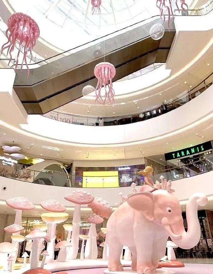 室内景观美陈常常陈设于较大的室内空间,特别是购物中心室内空间中。室内景观小品在室内空间环境中既有精神意识方面和审美方面的意义,又具有室内空间组织划分方面的功能性作用。