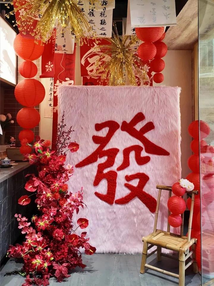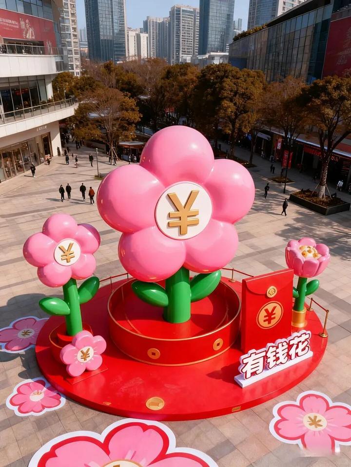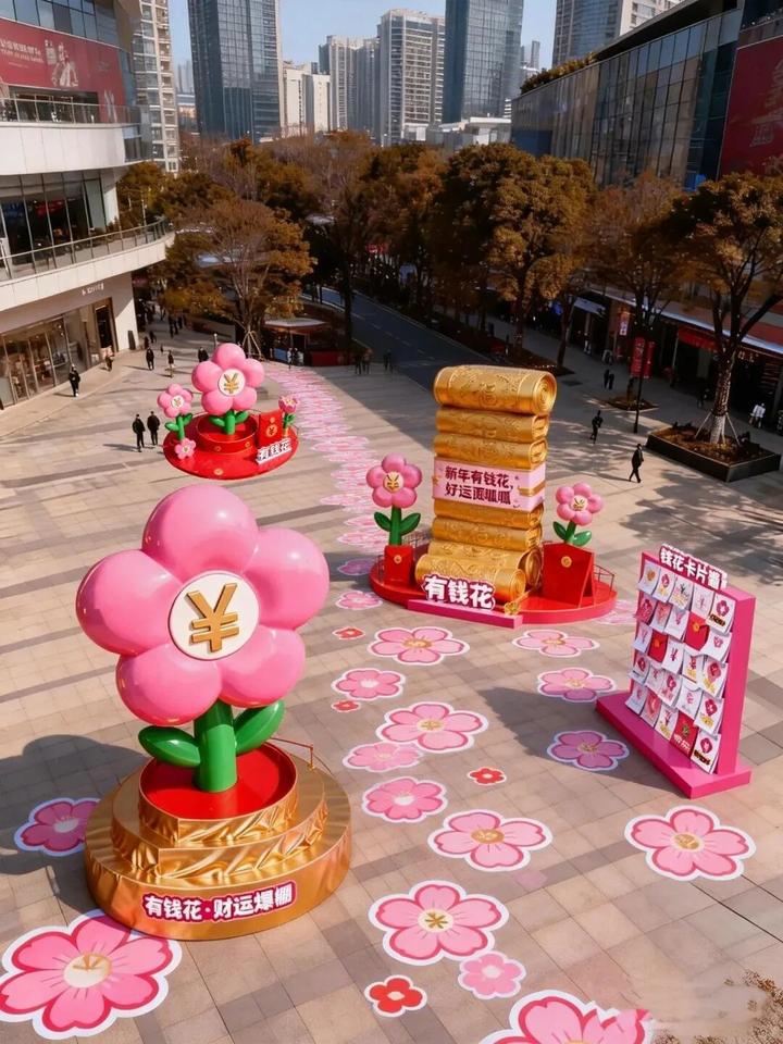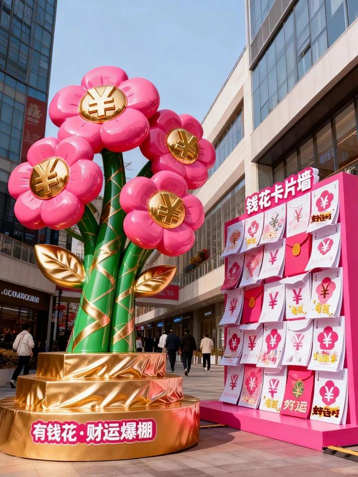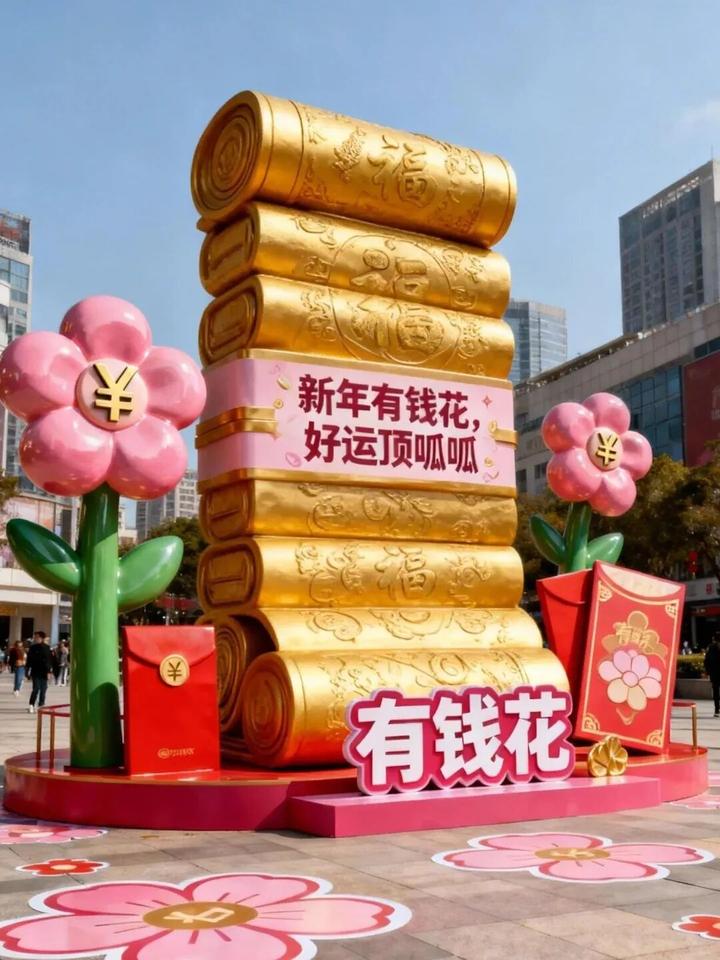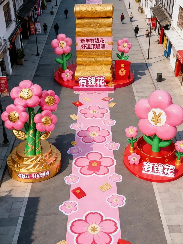 谁能拒绝“有钱花”?巨型粉色装置,花瓣嵌着¥符号,甜妹配色配财运气场,反差感拉满。卷轴好运立牌+地面花瓣贴纸,走过去像踩在“财运花路”。金色绸缎花托,“有钱花卡片墙”藏互动彩蛋。