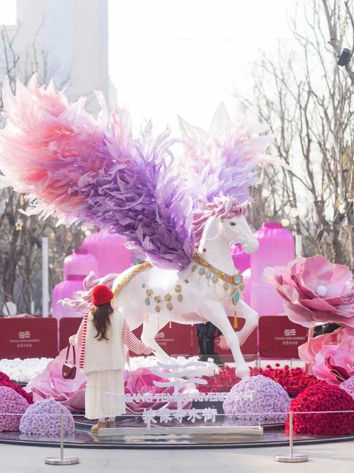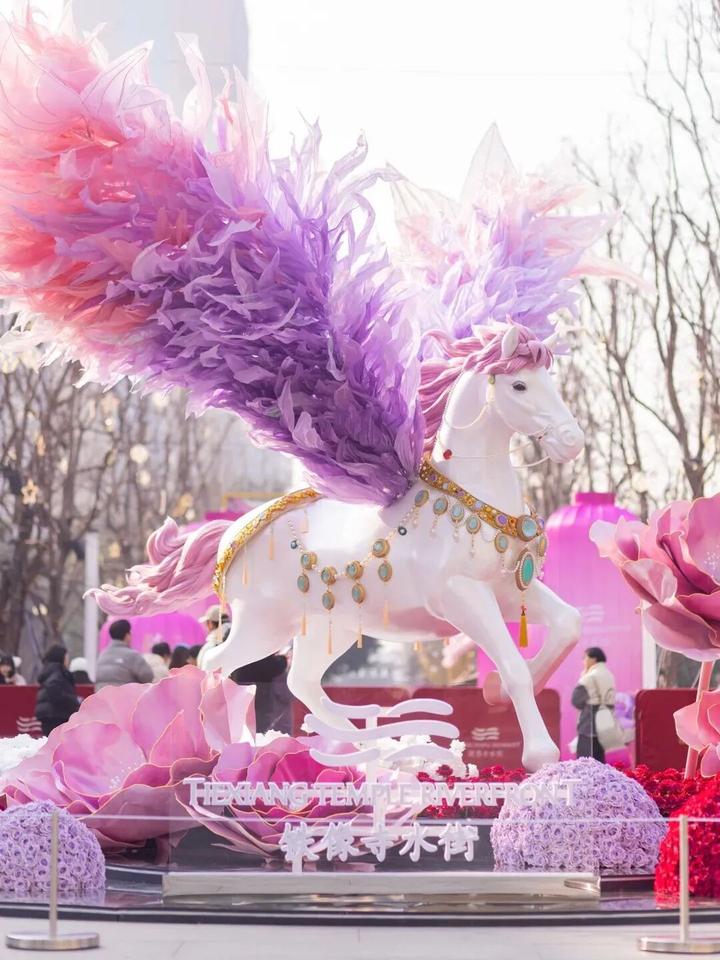 成都铁像寺水街《骋光·赋春》艺术装置,马年必打卡。紫粉飞马,流光纱羽翼+立体羽毛,每晚6点亮灯美到失语。周边装置、市集摊位全紫粉配色,搭配非遗市集、舞狮巡游、民乐演绎,白天晚上都有玩。