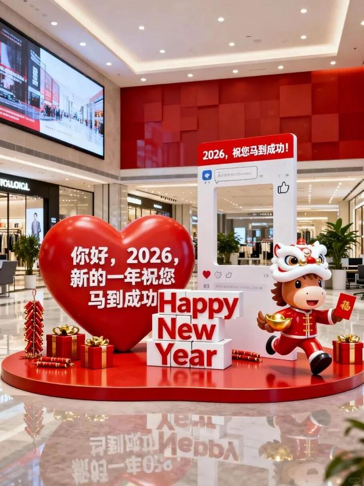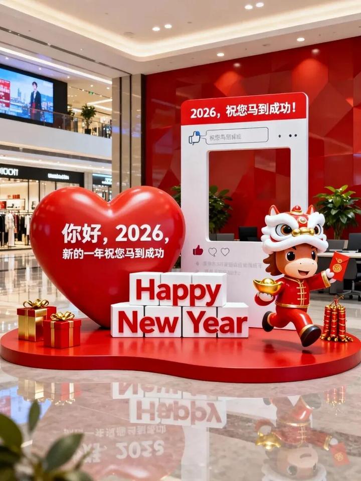现代职场新年互动装置,正红心形印“你好,新的一年马到成功”,白色立方体拼“Happy New Year”,聊天立牌设互动镂空。卡通小马奔跑,手持元宝红包,周围点缀礼盒鞭炮。