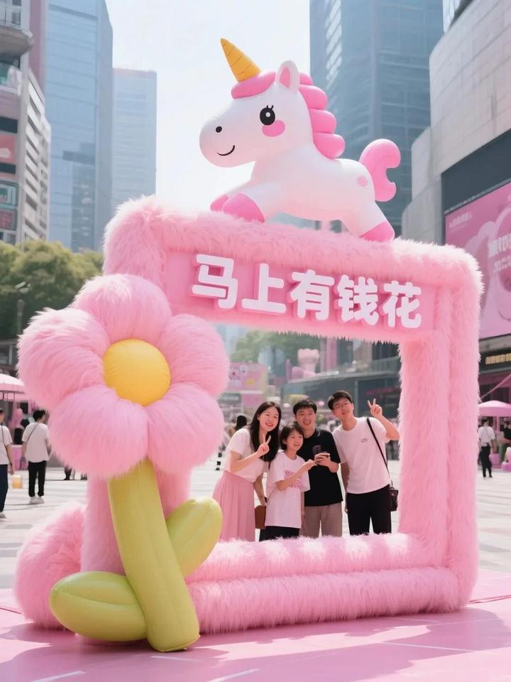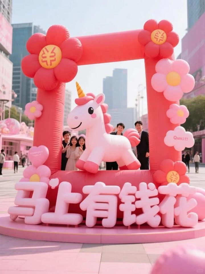 “站进这个相框,马上有钱花”——巨形好运打卡气模,治愈感爆棚。充气相框+小马造型,站在里面瞬间变可爱。仿聊天界面立牌设互动镂空,卡通小马红衣狮帽,手持元宝红包,奔跑姿态萌翻。