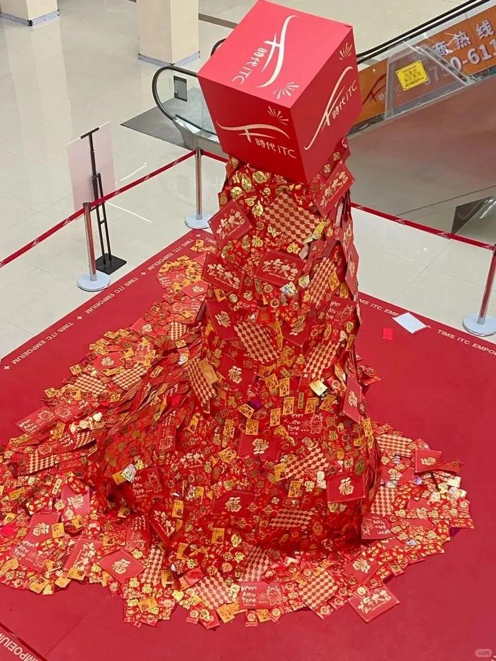 红包瀑布由无数红包堆叠,印“福”字吉祥图案,色彩鲜艳层次丰富。搭配装扮树,红灯笼彩球摇曳,寓意吉祥繁荣。