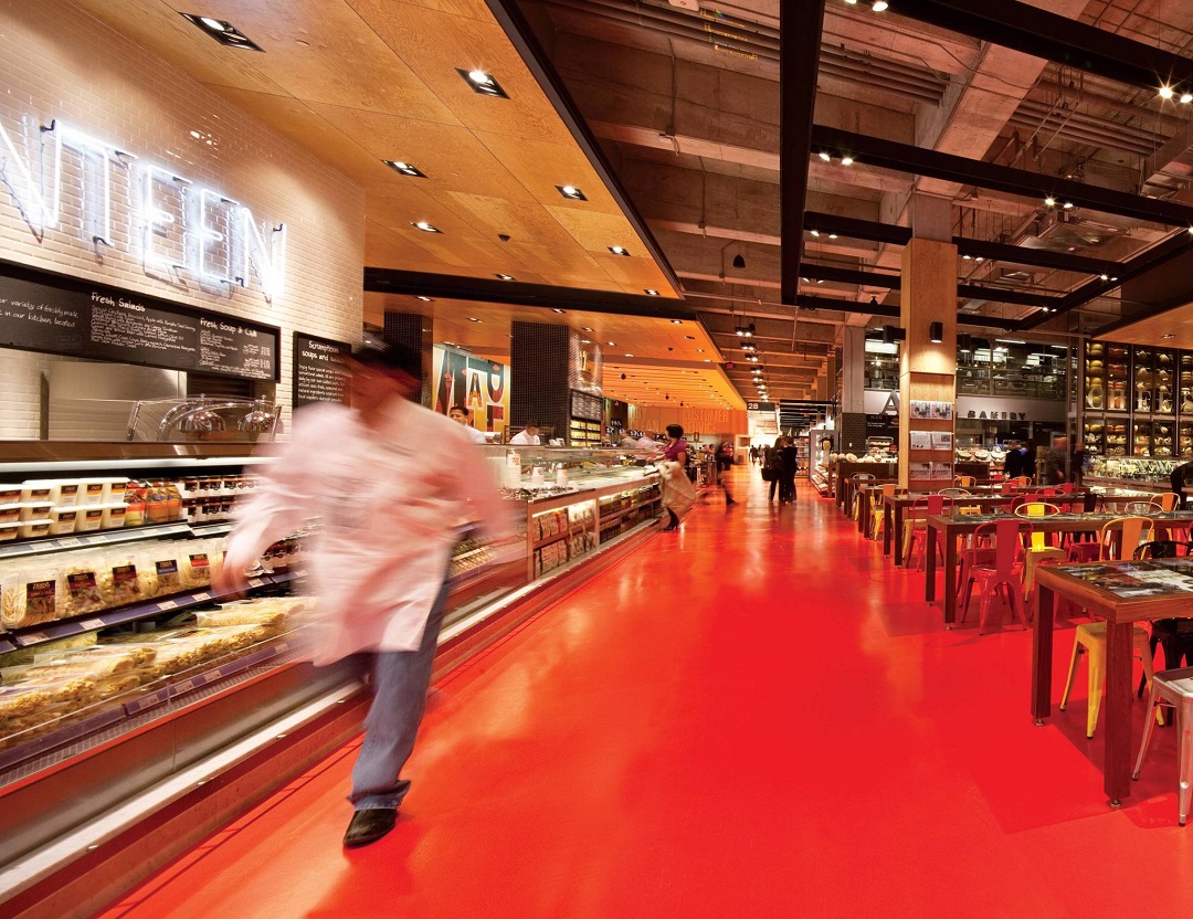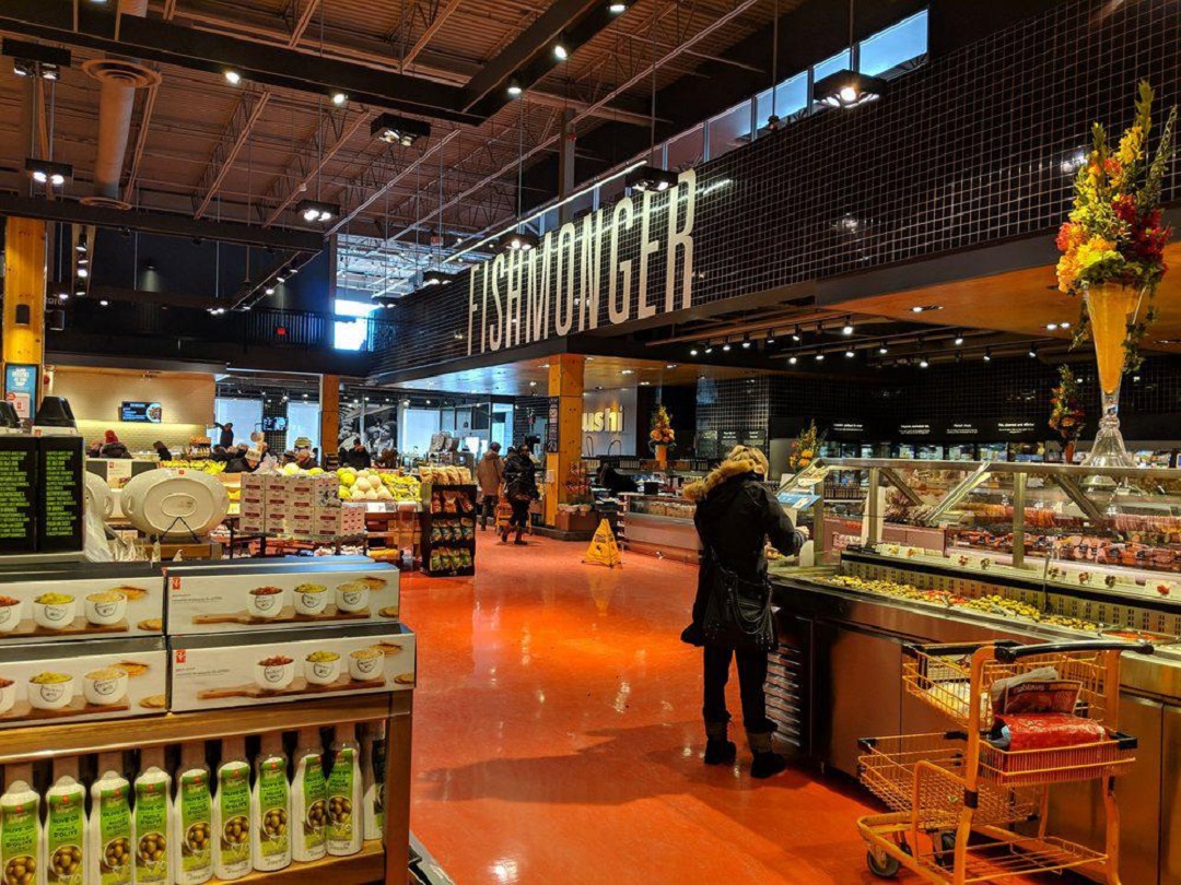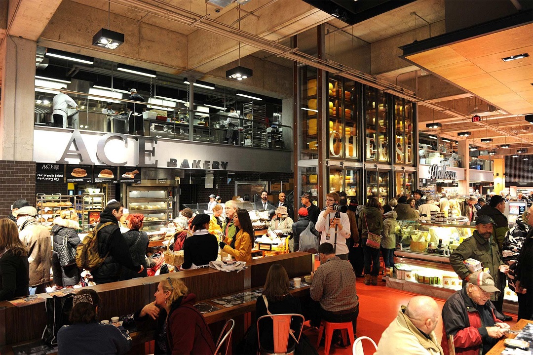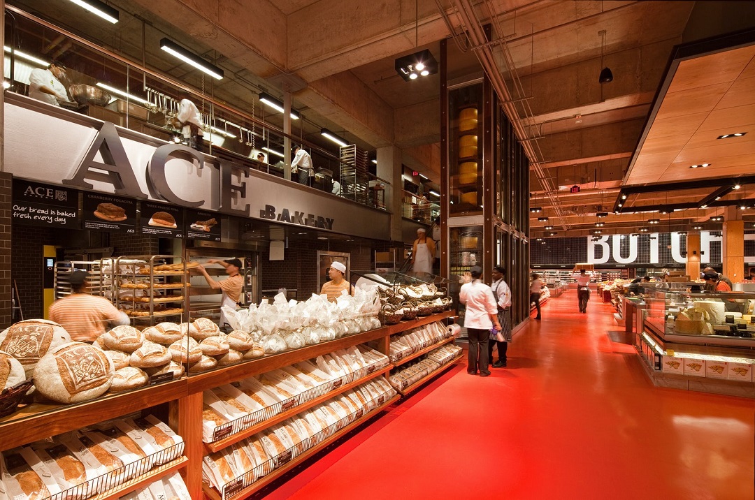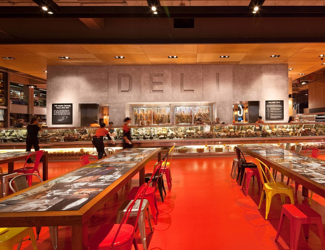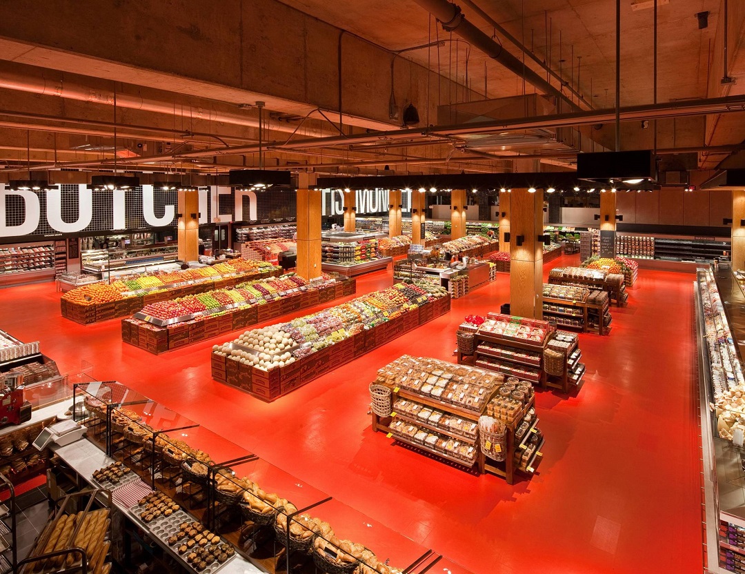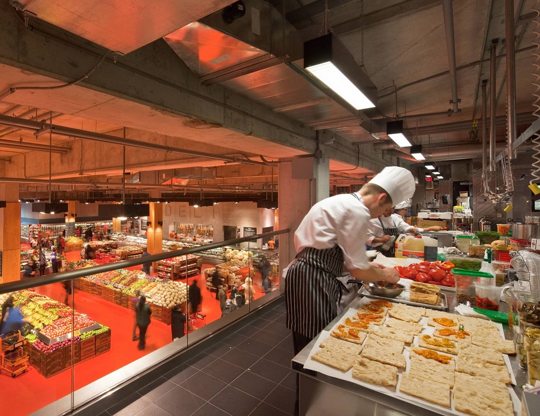 底层是一个4000 平方米的食品市场, 包含烘焙、开放式厨房、比萨、烧烤、沙拉寿司、糕点糖果、咖啡、食堂、奶酷甚至烹饪学校,此外还有鱼类、猪牛肉、熟食、水果、蔬菜以及花卉等等。