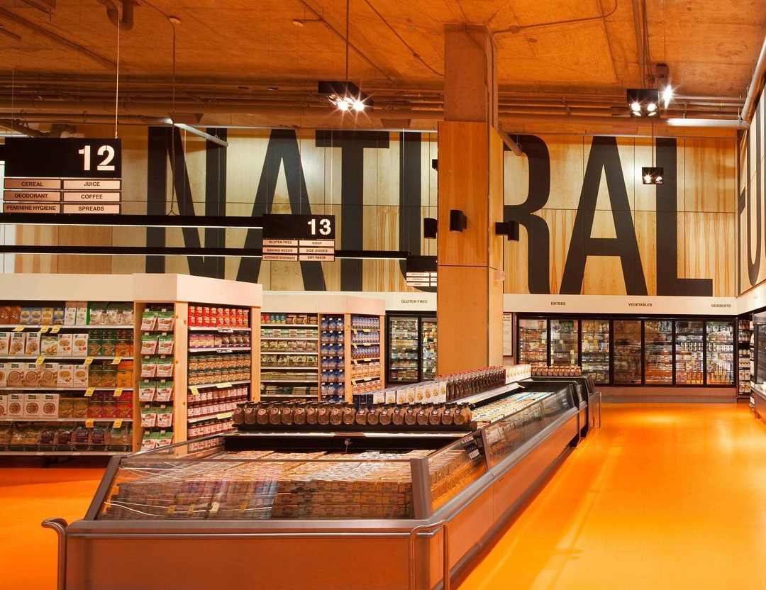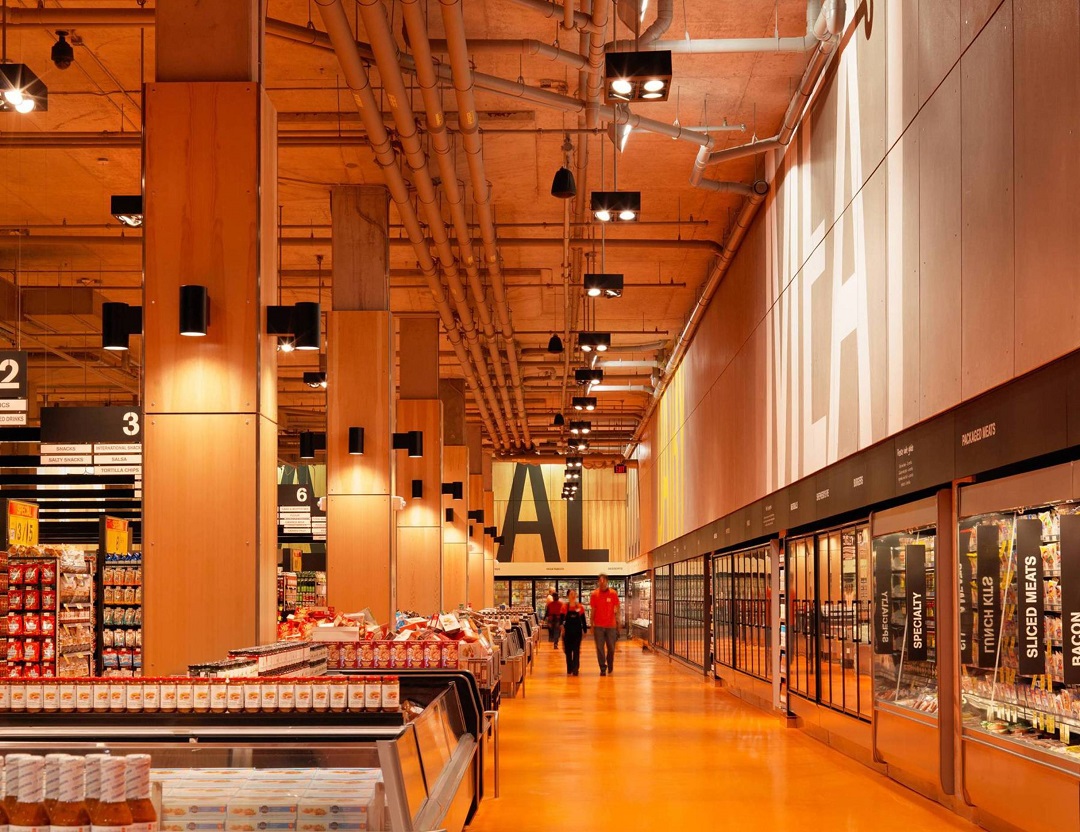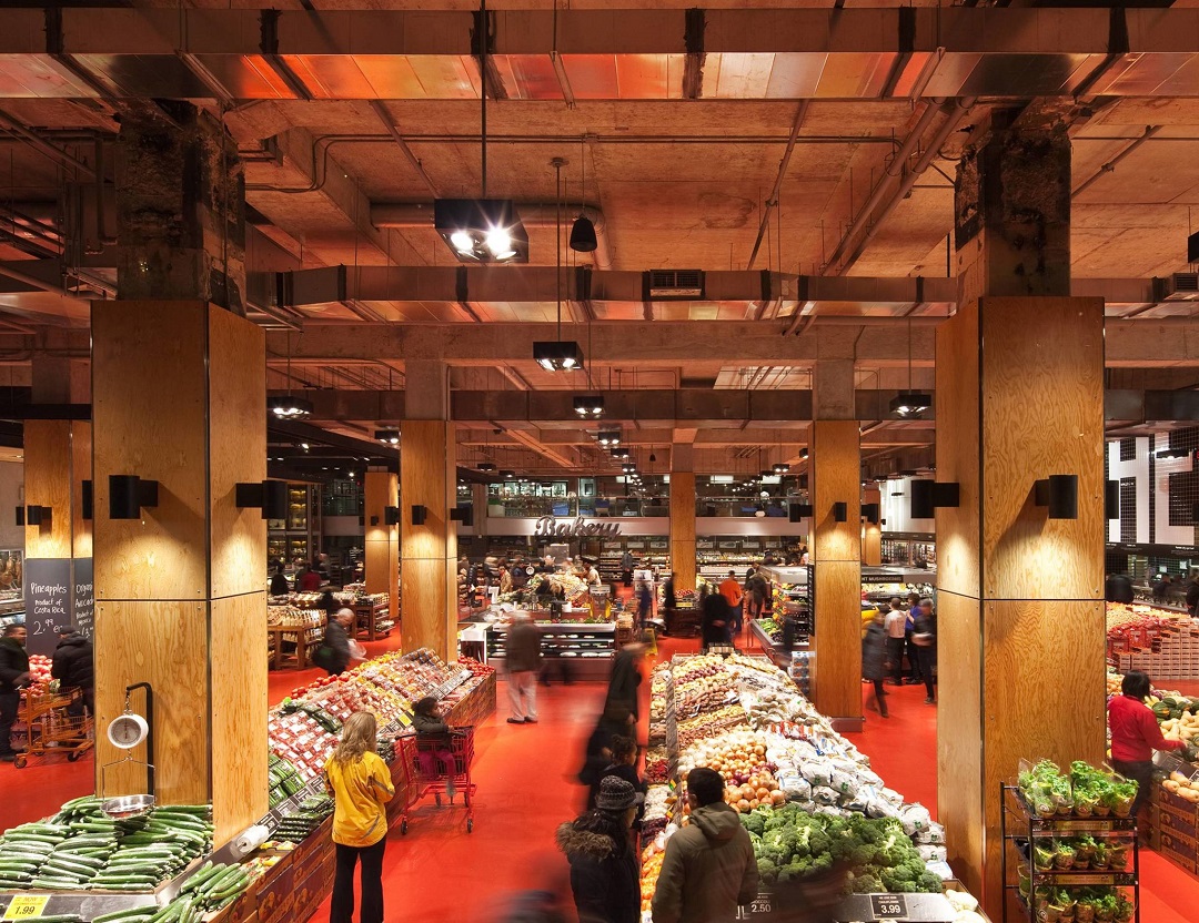 在过去的很长一段时间里,超市设计似乎并没有什么突破性的创新。而Loblaws超市的设计无疑打破了这一局面。项目建筑前身是一个冰球体育场,是一个不到8000方的场地,Loblaws超市的设计是在尊重原始建筑的前提下,去做的一个创新型的改造。