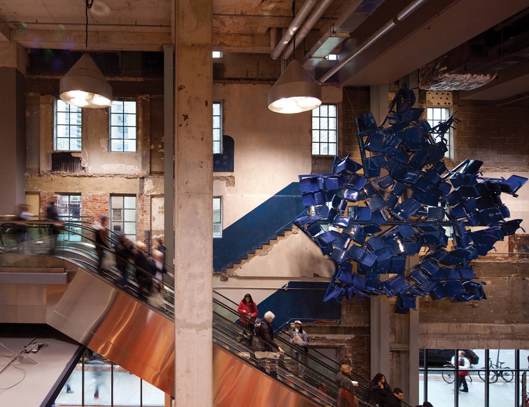 用原始建筑里面遗留下来的椅子、灯具、修复的窗户、裸露的混泥土墙、壁画和其他艺术图形构成巨大的枫叶形状雕塑,以设计的方式去致敬历史,去与过去的历史产生联接。