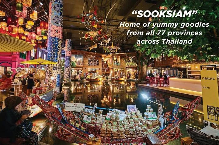 整个商场最能体现“泰国精髓”的要数其位于G层的特色市集——暹罗乐城(SOOKSIAM)。这座汇集全泰国77府特色产品的室内集市,共有超过3,000间小铺组成,主打“手工创造”理念,植入“现场创作”方式,将泰国各地区的风土人情、趣味面貌一一展现,泰国的艺术、手工艺、表演艺术和当地智慧都被融入一个空间之中,来到这里相当于去了整个泰国。