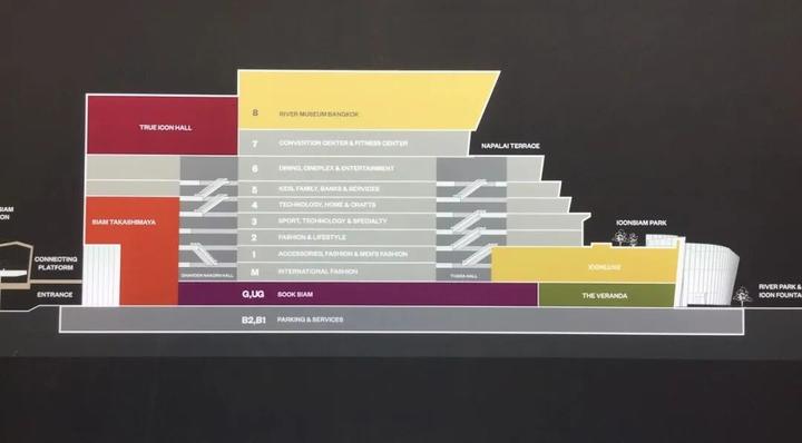ICONSIAM总共分为地下4层,地上8层,商城中500多家店铺全部来自世界一线的顶尖知名品牌,其中有多家为中南半岛或泰国首家。