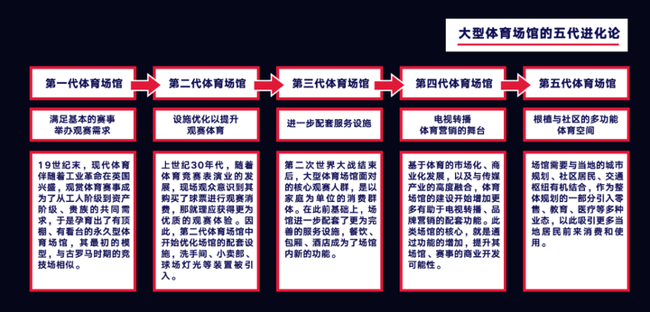 曾任2000年悉尼奥运会和2012年伦敦奥运会主场馆设计工作的罗德·希尔德(Rod Sheard)先生,早在2005年就提出了体育场馆的五代进化论:体育场馆由最初满足基本赛事、观赛需求,逐步被赋予社交、休闲、商业化、电视转播主体等功能,逐步进化至目前的第五代模式,暨成为城市、社区发展的重要工具。