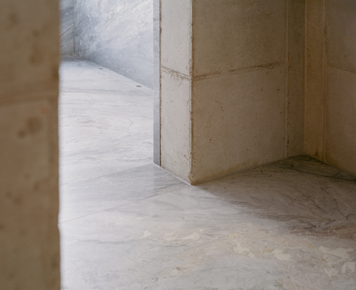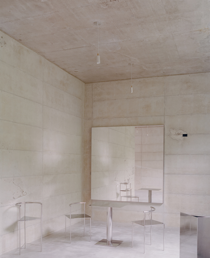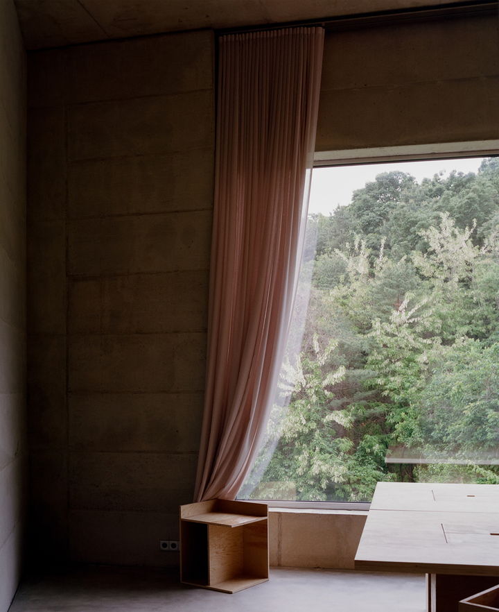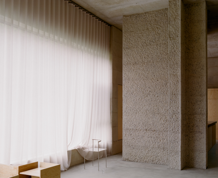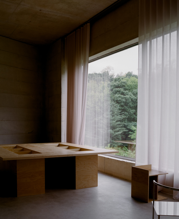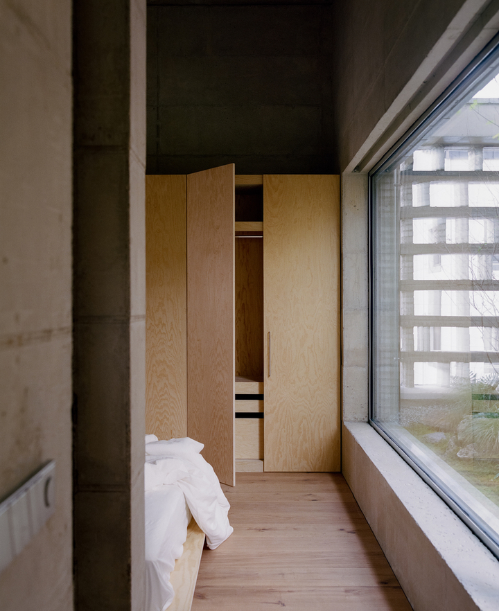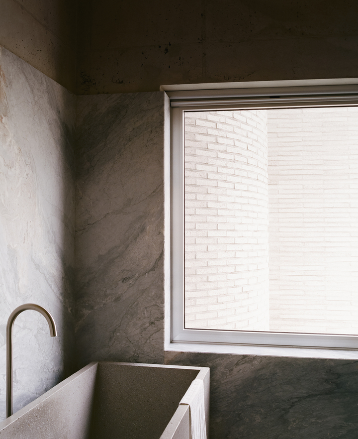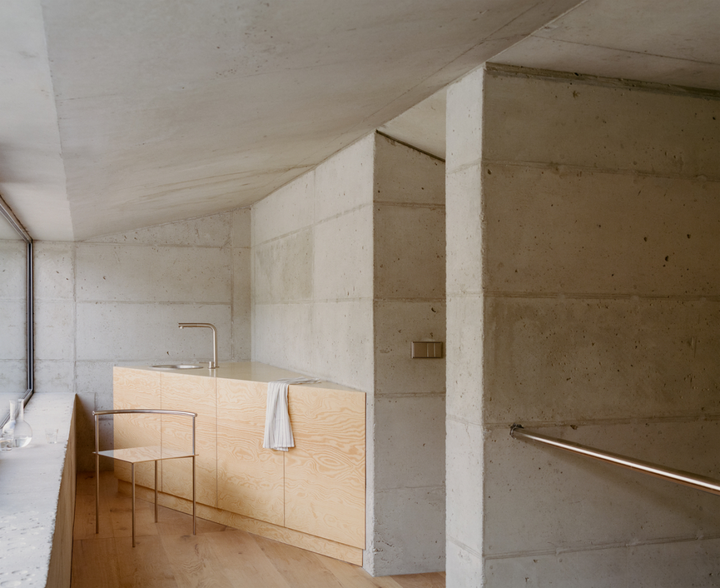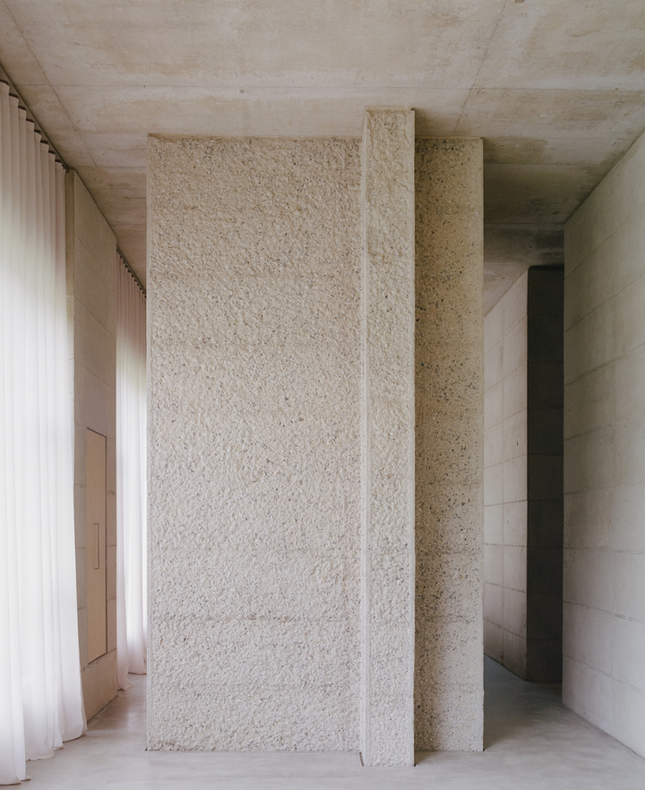 空间内的混凝土墙面不仅增添了空间的坚固感和自然感,也通过材料本身的纹理和冷暖变化,在室内创造出一种永恒而真实的存在,还呼应了外立面的设计。