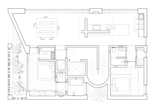 此外,顶层空间还包括三间卧室,设计上采用简洁的线条和自然材料,确保了宁静且舒适的氛围。木地板与混凝土墙面的搭配,不仅营造出自然质感,也让空间显得更加温馨与平衡。
