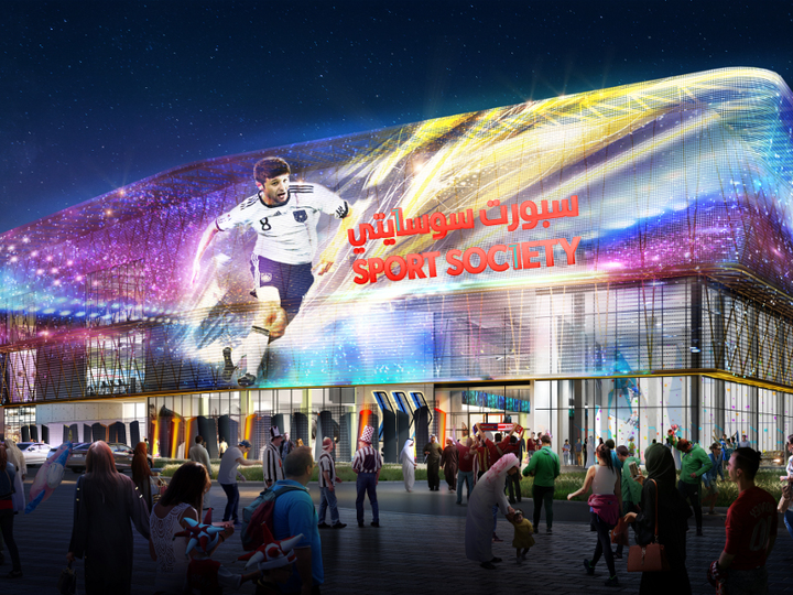 活动屋顶在需要时也可“变身”为一个运动场;室外LED屏幕主要用作赛事转播,室内屏幕除了可服务于赛事之外,亦可用作艺术装置。