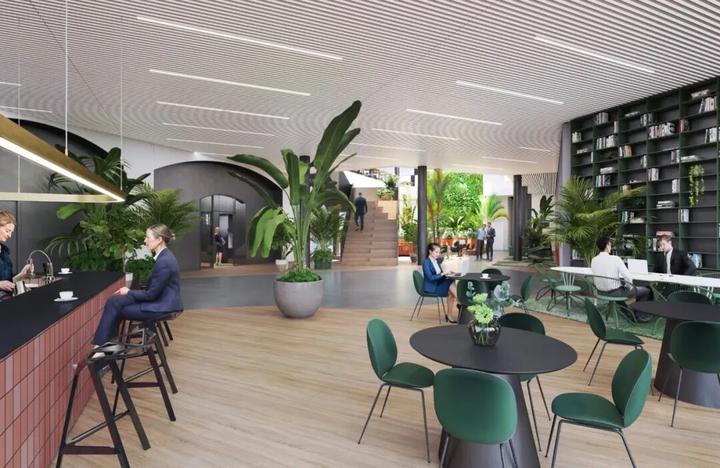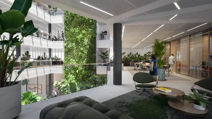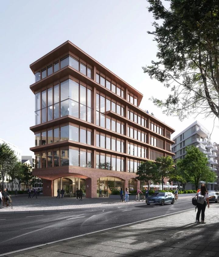 该开发项目的设计是为了充分利用水面上的景观。不断变化的水景是大型屋顶平台的主要吸引力,它提供了一个有吸引力的公共空间,最大限度地发挥了场地的潜力。办公楼层的悬臂框住了有代表性的景观,并为下面的开口提供了阴凉。绿色植物也被整合到综合体的设计中,以强调其与环境的联系。