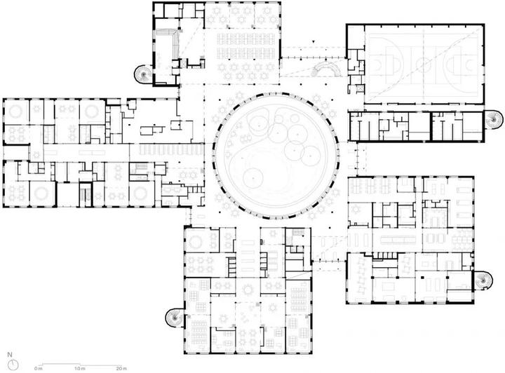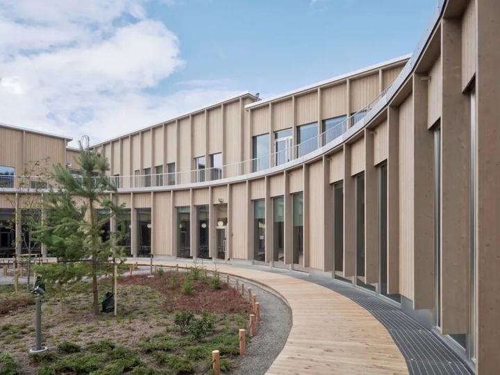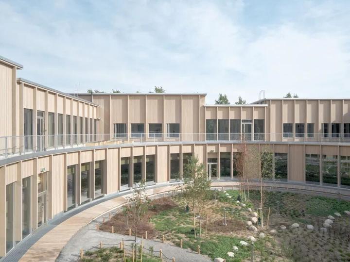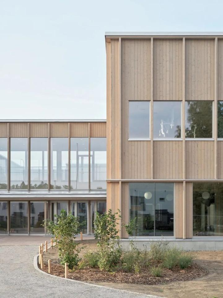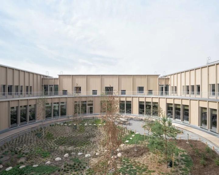 这座创新的教育综合体由五座独立的木制建筑围绕一个名为"森林空地"的中央绿色庭院排列,为700名小学生和238名幼儿园学生提供了一个充满活力的学习环境。