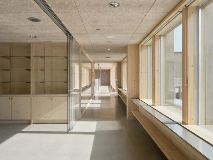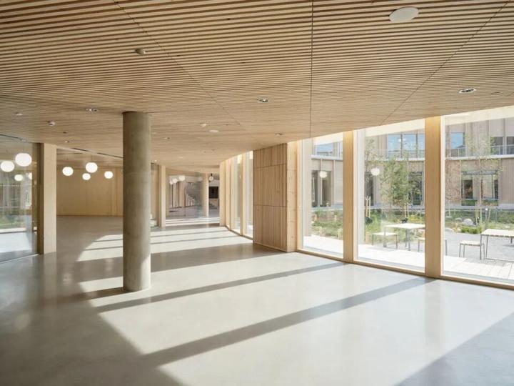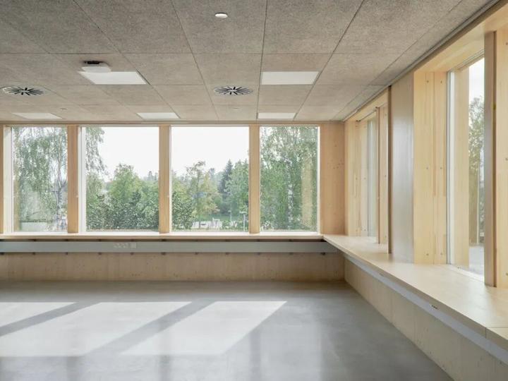 建筑最显著的特色是其以学习者为中心的人性化设计理念。通过模块化的木结构建造,项目成为赫尔辛基首批采用大体量木结构的学校之一。设计团队精心打造了一个绿色且灵活的学习环境,支持学生的身心健康、专注力和创造力的发展。每个建筑单元都具有独特的特色,包含多样化的功能空间,从学习区域到食堂、体育馆、科技艺术设施等。