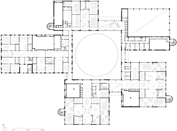 项目特别关注自然采光和户外连接,中央的圆形庭院不仅为建筑核心区域引入充足的自然光,还创造了宝贵的户外学习和社交空间。本地芬兰植物的运用进一步强化了与自然的联系,成为教学实践的重要组成部分。建筑外立面采用垂直构件的木质覆面,灵感来自周围公园的树木,创造出内外空间的动态互动。
