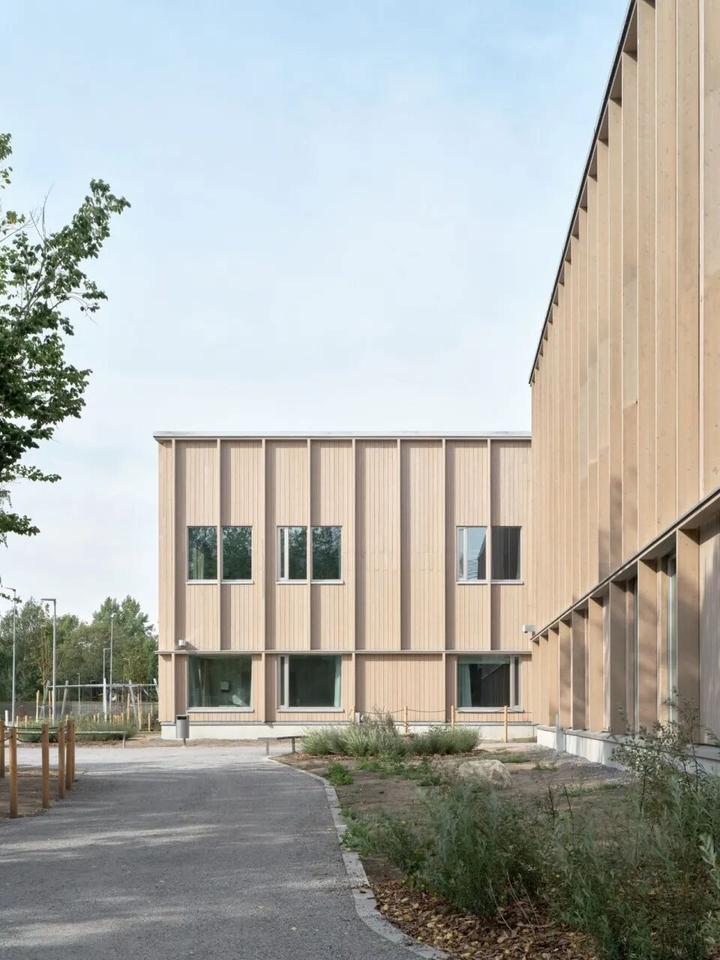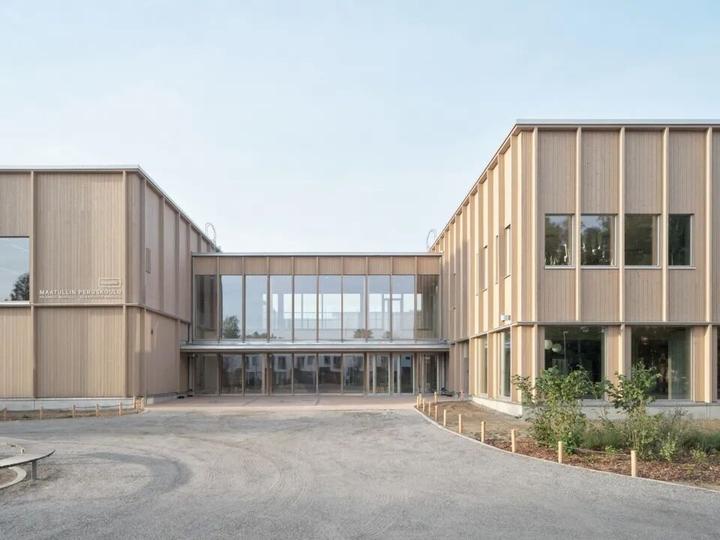 Maatulli学校和幼儿园是赫尔辛基首批采用模块化大规模木结构建造的学校建筑之一。建筑的木质外墙装饰了垂直的竖框,灵感来源于周围公园中的树木,在建筑内外部之间形成了一种动态的关联。外墙设计了五种不同的类型,以此区分每栋建筑的独特功能。设计者选择了来自当地的云杉作为主要建材,充分发挥了木材的天然特性,和自然形态,使建筑能够随着周围环境的变化而变化。