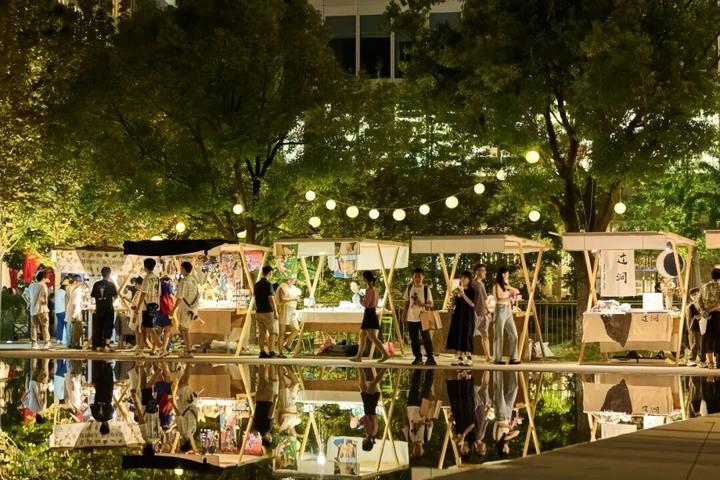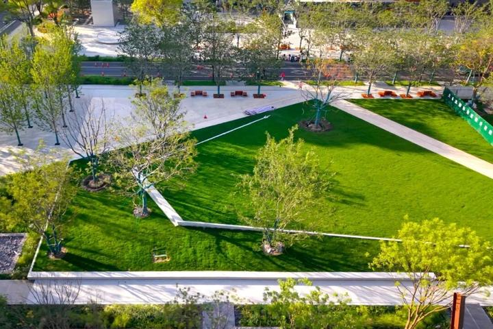 延续天目里“楼顶茶园”生态理念,更新后的立体绿化“楼顶茶园+地面绿化”有效改善微气候,智能灌溉提升水资源利用率。新增的北园草坪、南岸亲水平台、莲花广场等300亩高品质空间成为市民休闲娱乐的新地标。