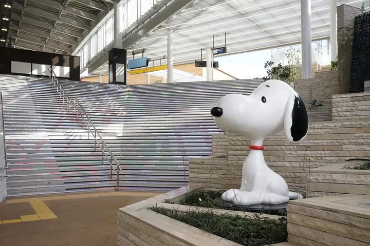 出口处的大阶梯自然将乘客引入商业区域,营造了浓郁的商业氛围。结合出口处的大阶梯配置的绿植和流水景观,给予乘客身心放松,如同自然度假游乐园的视听享受。乘客从车站下车后就能感受到大自然的气息,商业设施中配置各式绿植和无处不在的吉祥物史努比让消费者感到亲切和舒适。
