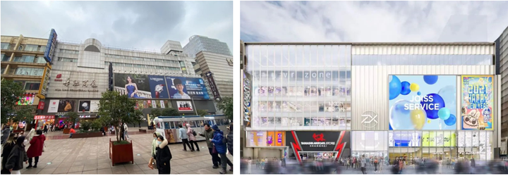 图4:改造前的华联商厦与改造后效果图
