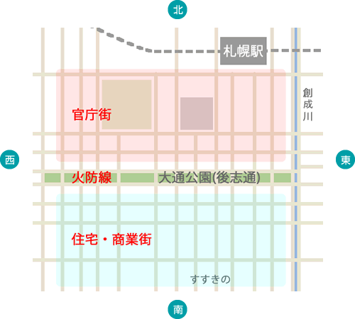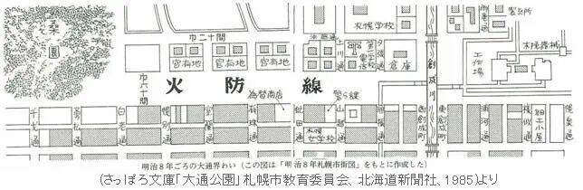 在札幌设计城市布局之初,就存在一条南北向的城市主轴。根据岛义勇留下的城市建设蓝本《石狩国本府指図》来看,他希望在首府的正前方建设一条向南延伸的12间宽的大道,作为政府办公室和城镇房屋之间的防火隔离带。1871年,岩村通俊参考岛义勇的设想,在札幌的城区中心建设了一条防火线,将城市中心划分为北部的政府办公区和南部的住宅及商业区。1872年,这条防火线取名为“后志通”,火线两侧的道路按照南北方位分别被取名为“浜益通”以及“渡岛通”。由于太过复杂,其改为了目前札幌所使用的街道名称,而中央的防火线也更名为如今的“大通”,即大通公园所在的区域。