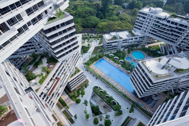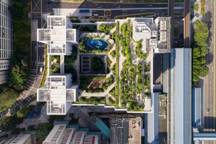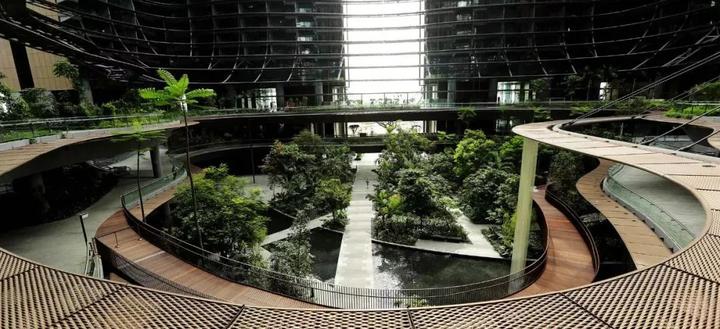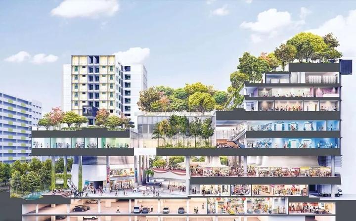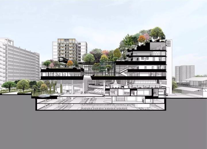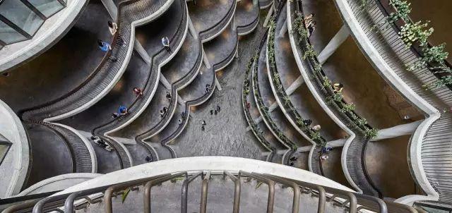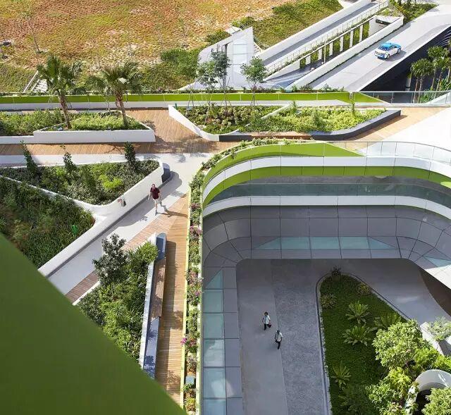 Kampung Admiralty综合社区大楼是集社区、医疗、老人社区、小型公寓、社区公园为一体的综合建筑。其中最引人注意的就是其社区公园,社区公园采用梯田布局最终形成垂直绿化景观,为104套公寓提供休闲的去处。它还利植物控制室内温度,并形成一套屏障隔绝火车铁轨带来的噪音。