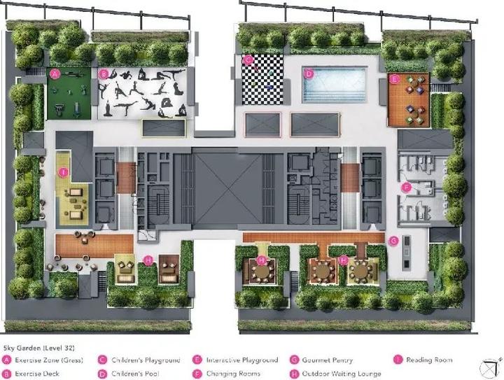 设计摒弃一座座一柱擎天的摩天楼格式,把31栋70米长、6层高的小楼,循着六角形的格式叠排,让住户景观更多元化,能望向四周绿荫与景色,同时也让每座都无法望入邻家,更具隐私。层叠的破格设计也为楼隔距离增至56.5米,大大增加了呼吸空间和隐私感。