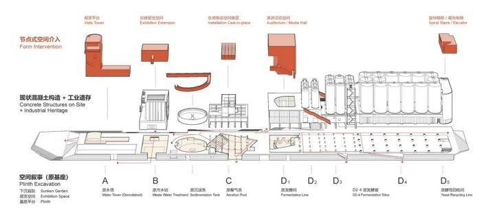D 栋是最具标志性的工业遗存场景,屋顶矗立 33 个白色筒仓,穿过楼板进入室内现身为巨大的不锈钢倒椎体,悬挂在天花板上,下方是密集有序的管道,我们有选择性地结合展览叙事予以保留或改造。