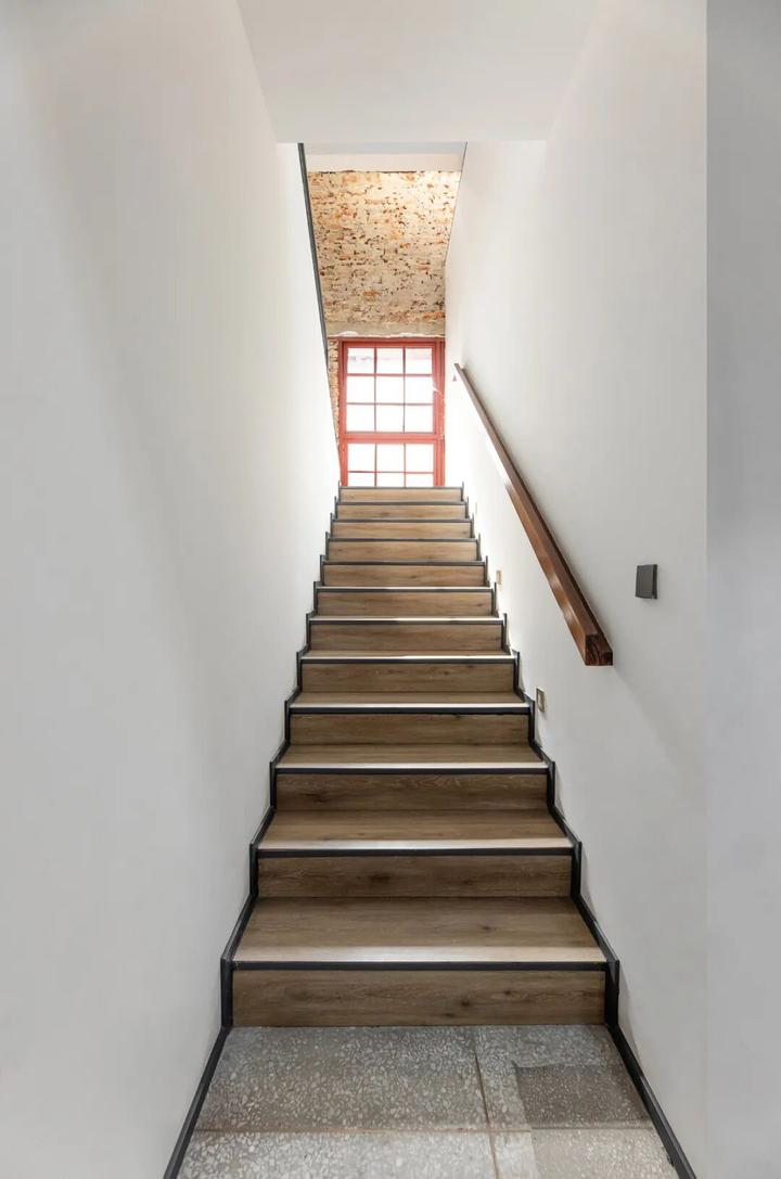 D5栋为四层的原酵母回收间。一层天花板局部切掉,以台阶联通一二层作为展示及休息区。屋顶加建一个钢结构红色盒子,与南边A栋遥相呼应,盒子北侧落地玻璃窗,引入山体公园的绿色,成为工遗建筑群北侧面向城市的窗口。