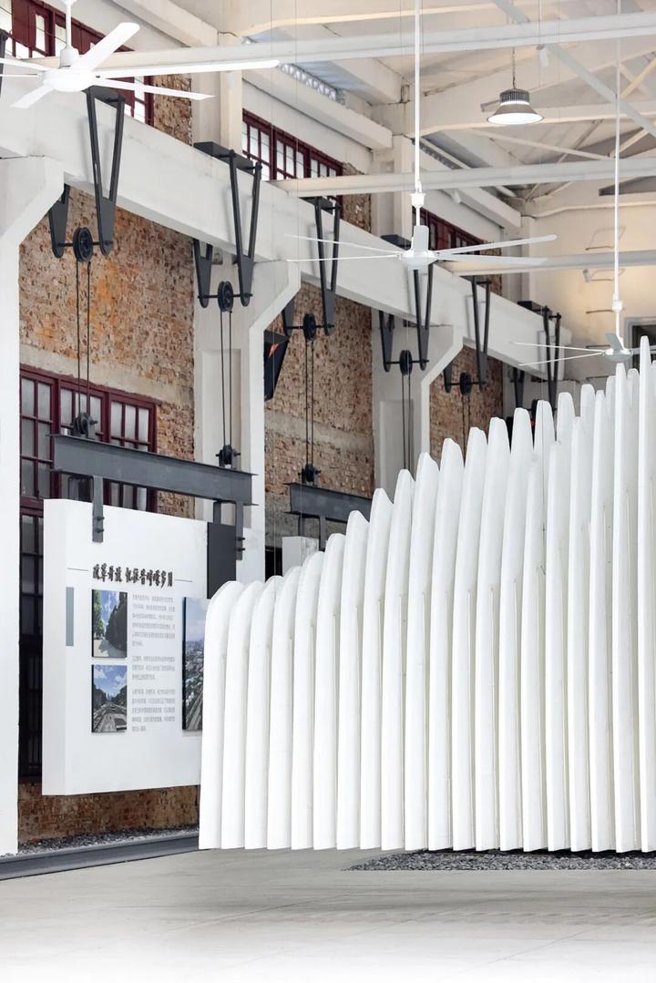 吊装展板的组件设计灵感来源于厂房原有的滑轮设备。铁路中常见的工字型轨道、枕木、碎石、铆钉等元素,反复运用于展墙与沙盘的设计细节中,以老物件的功能承续,呼应场地记忆的衍生更新。