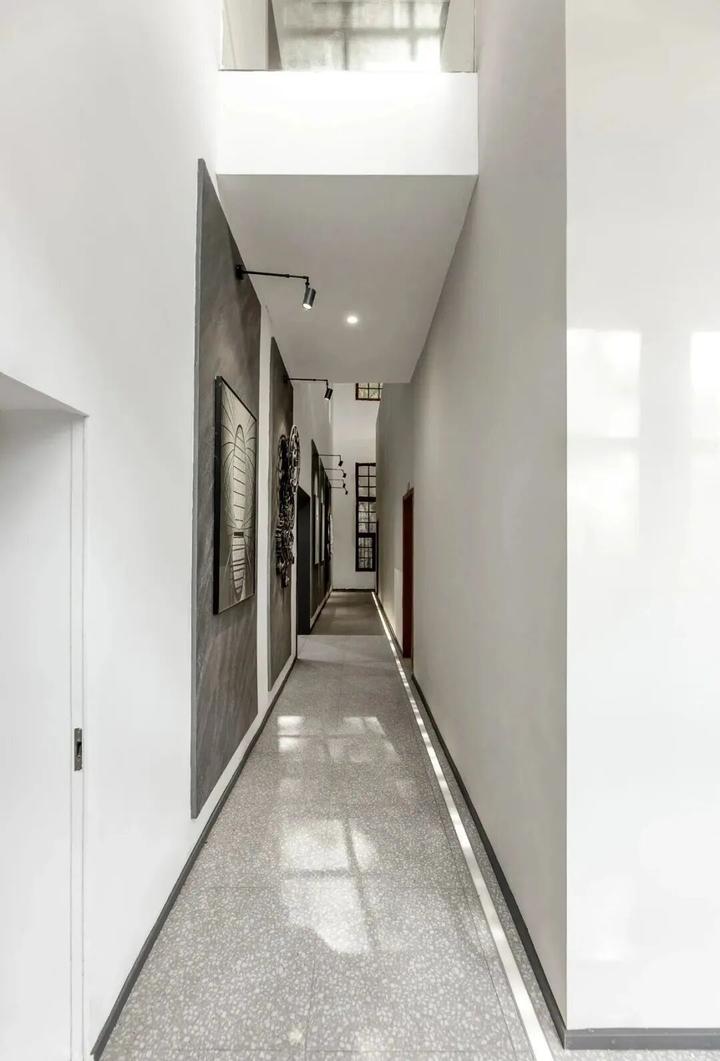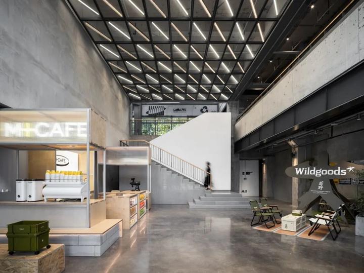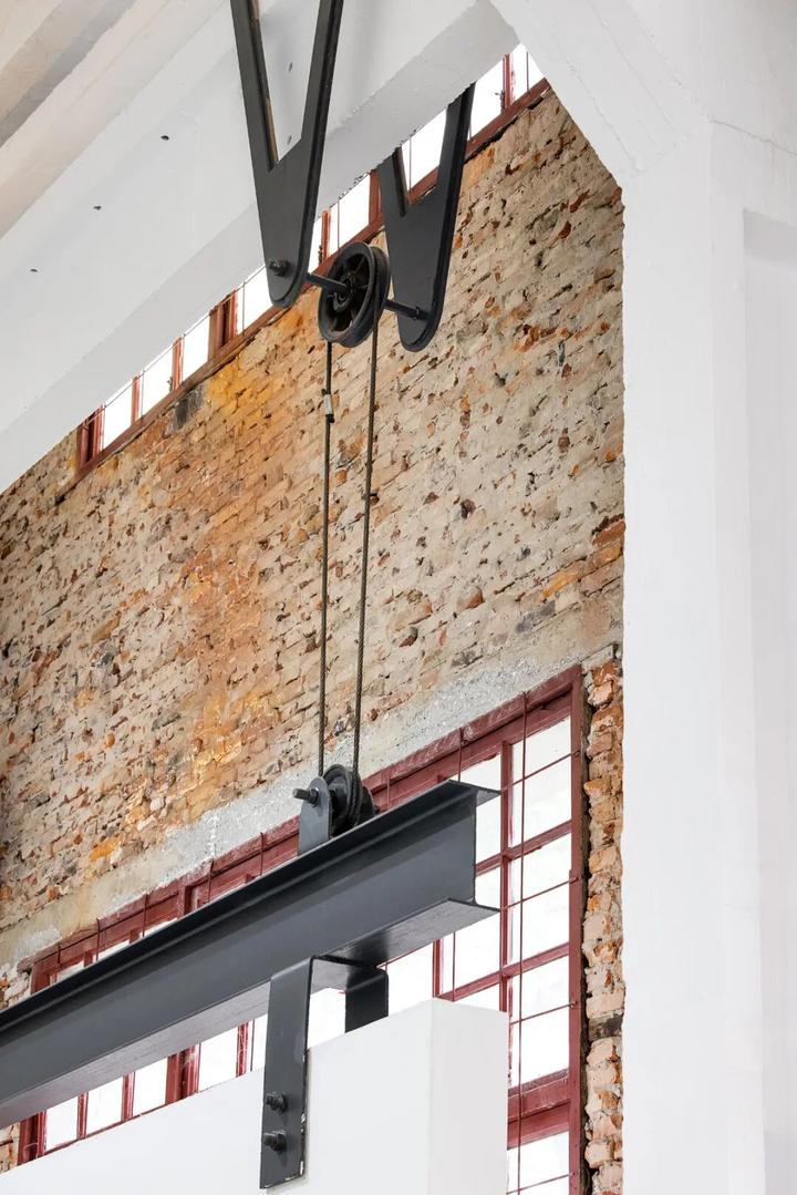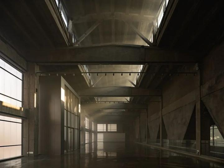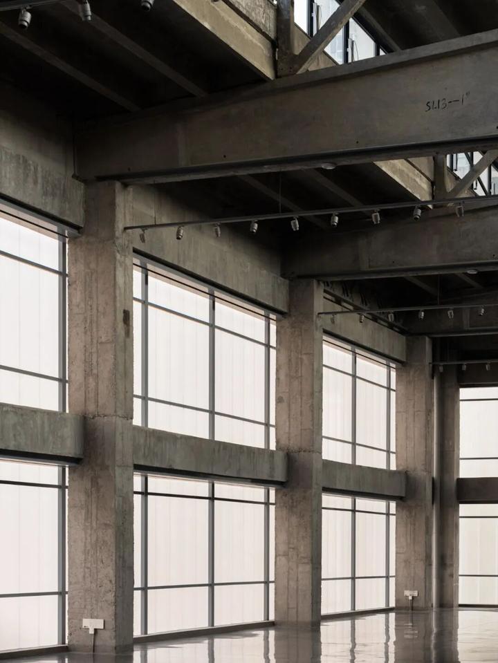 原始建筑的龙门钢架被完整保留,灯光依循纯白的顶面延伸布局,照亮厂房的结构之美。