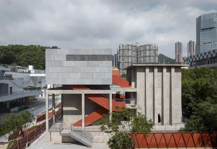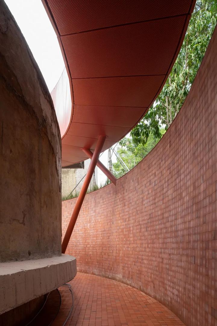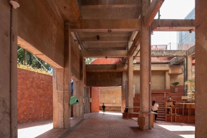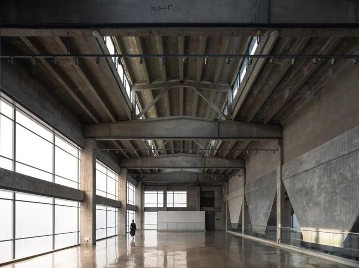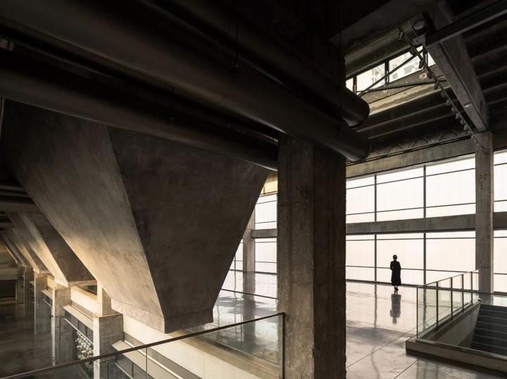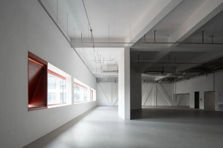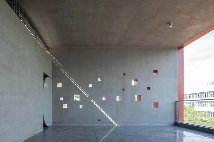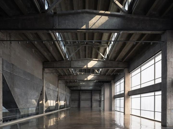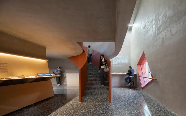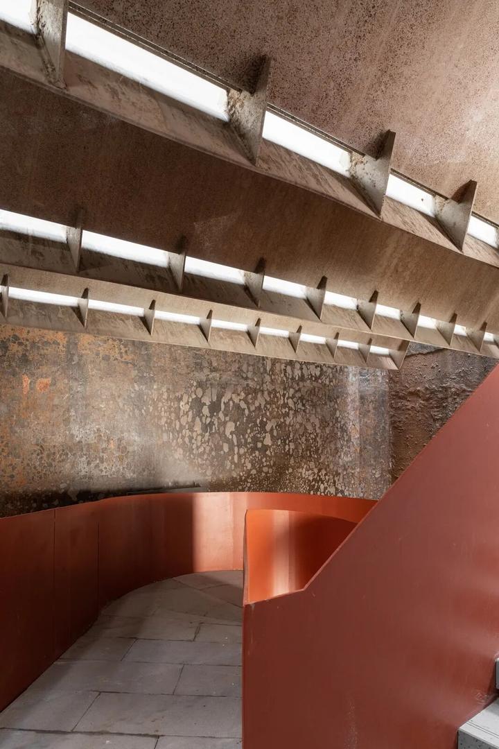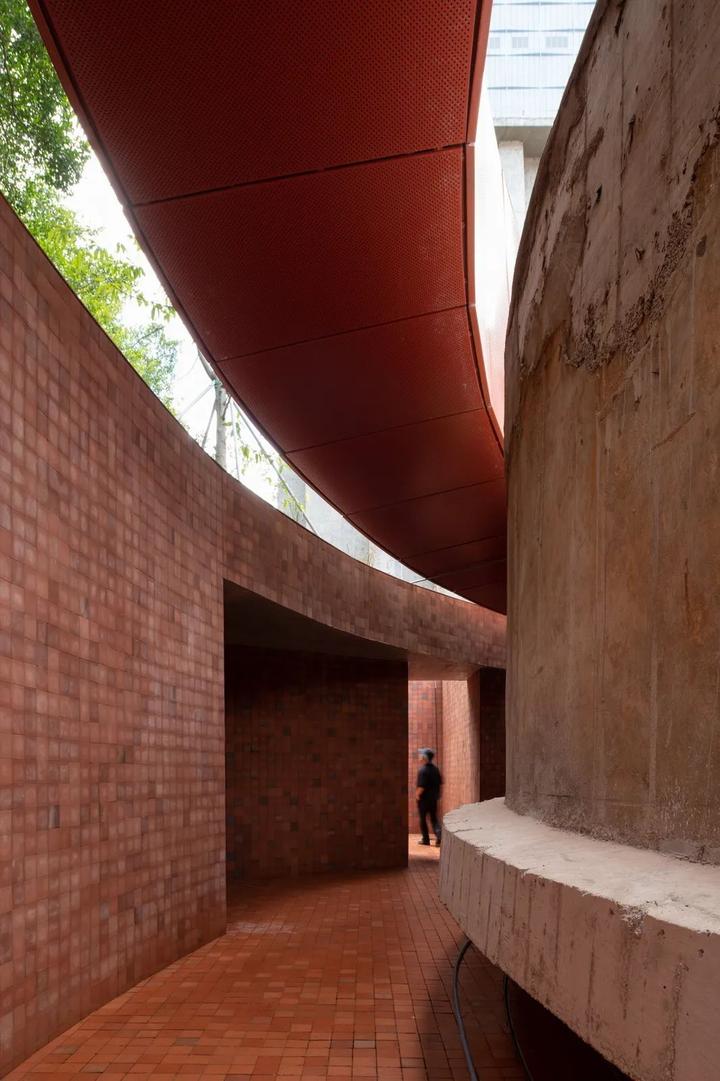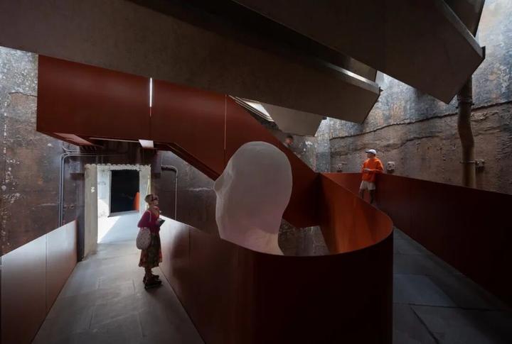 凿开 B 座污水站、C 座曝气池建筑物原密闭的水池空间,削去表面瓷砖,裸露高耸的混凝土结构下方,红色手工砖似火焰蔓延,覆盖台阶与地面。在 B 座顶部加建 300 平方米的钢结构盒子展厅,其泡沫铝板外饰面的金属质感与主体混凝土的厚重完美融合。